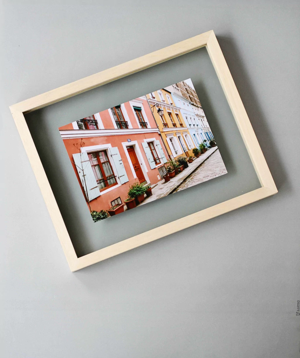Con este tipo de enmarcado vas a poder destacar tus imágenes dándoles un toque fresco y diferente. En este caso utilizamos otro vidrio para el fondo del cuadro, por lo que el margen que queda alrededor de la obra se vuelve transparente. Tu obra flota y el fondo cambia según dónde lo coloques.